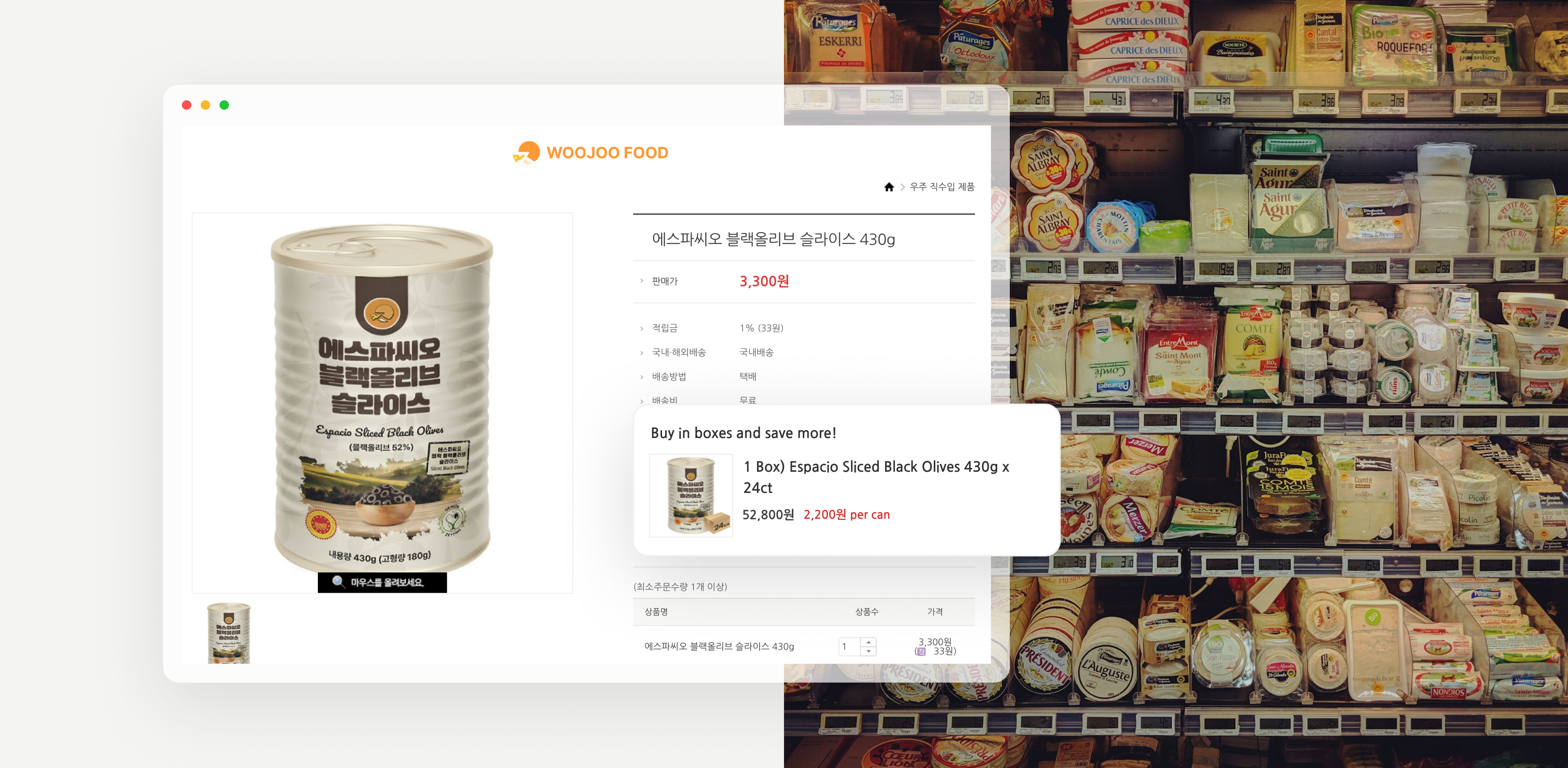 WOOJOO is a B2B E-commerce platform that primarily sells a variety of imported food ingredients, including cheese and pasta. Its primary customers are restaurants and schools that require bulk purchases.